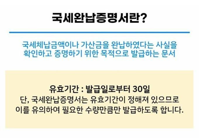 국세완납증명서는 발급일로부터 30일간 유효하므로, 실제 필요한 시점에 맞춰 발급받으시는 것이 좋습니다. 또한, 체납된 세금이 있다면 반드시 납부 후 발급을 진행해야 합니다.