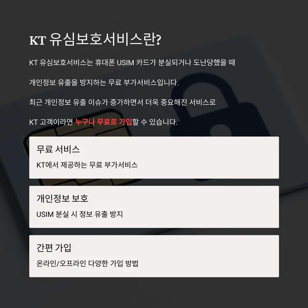 #KT유심보호서비스 #유심보안 #휴대폰보안 #개인정보보호 #모바일보안 #KT통신 #스마트폰보안 #유심카드 #보안서비스 #통신보안 #디지털보안 #KT서비스 #휴대폰분실대비 #모바일보안서비스 #통신사서비스